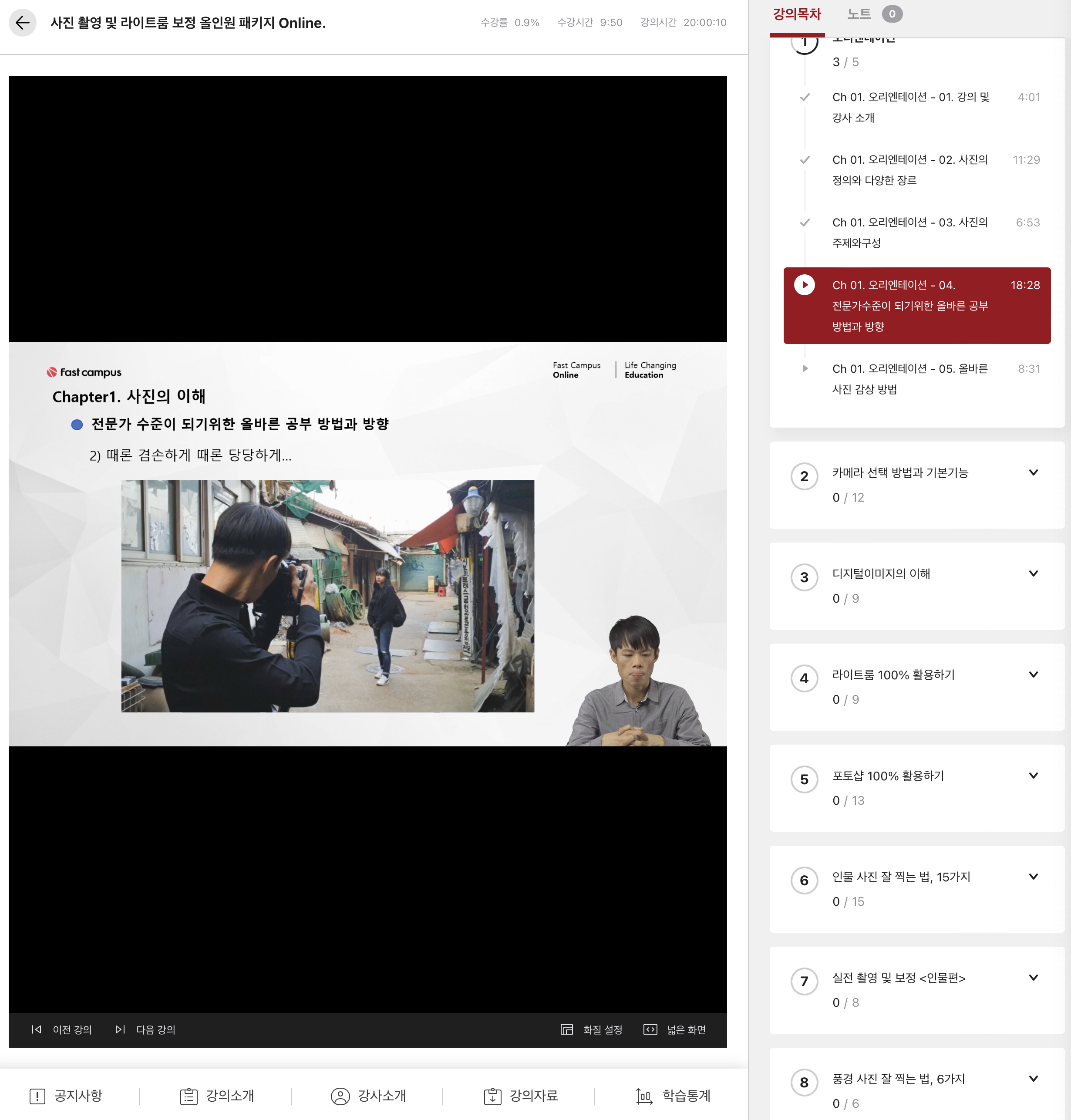 그래서 일단 까먹기 전에 정리하는 갑작스러운 패스트캠퍼스의 장단점 하나 짚고 넘어갈게요. 패스트캠퍼스 강의들이 하나하나 강사진이나 강의 내용이 어느 정도 수준이 된다고 생각돼서 제법 볼만하더라구요. 지금까지 국비지원 과정 2과정, 사진 강의, 주식 강의, 사무자동화 강의 이렇게 등록했는데, 다들 조금씩 들어 본 결과 정말 현업 종사자이며 전문가들이 나와 설명을 해 줍니다. 웹으로 볼 때는 강의 레이아웃도 잘 되어 있고 강의 자료도 잘 올라와 있어서 보기에 편하더라구요.