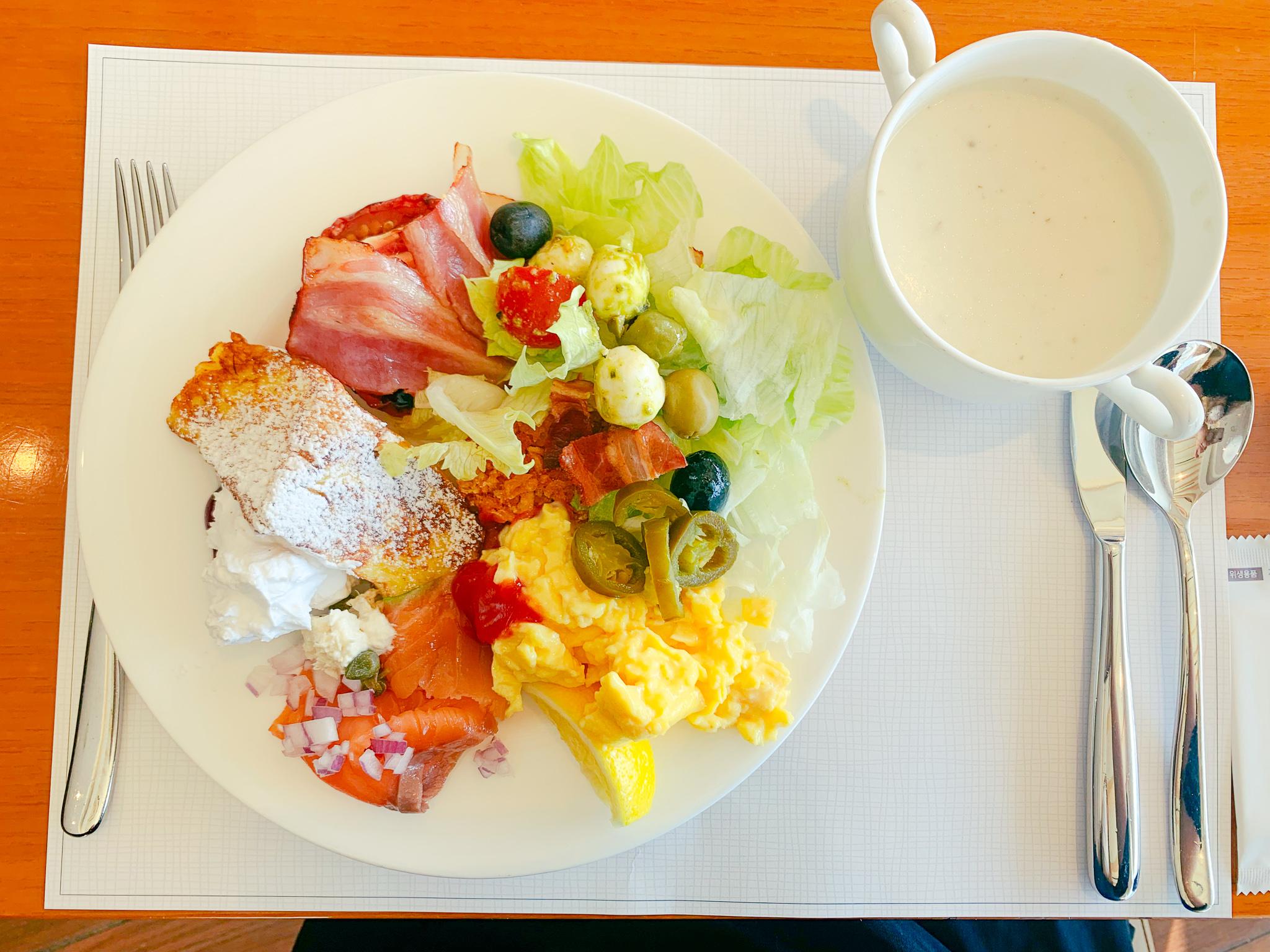 게다가 조식을 잘 안 먹지만 조식도 포함이라 갔는데 어쩜 그렇게 맛있는지. 마침 창가자리가 나서 바다와 풀장을 보면서 먹는데 날씨도 깨끗하고 예뻐서 더 맛있다는 생각이 든 것 같기도 하다.