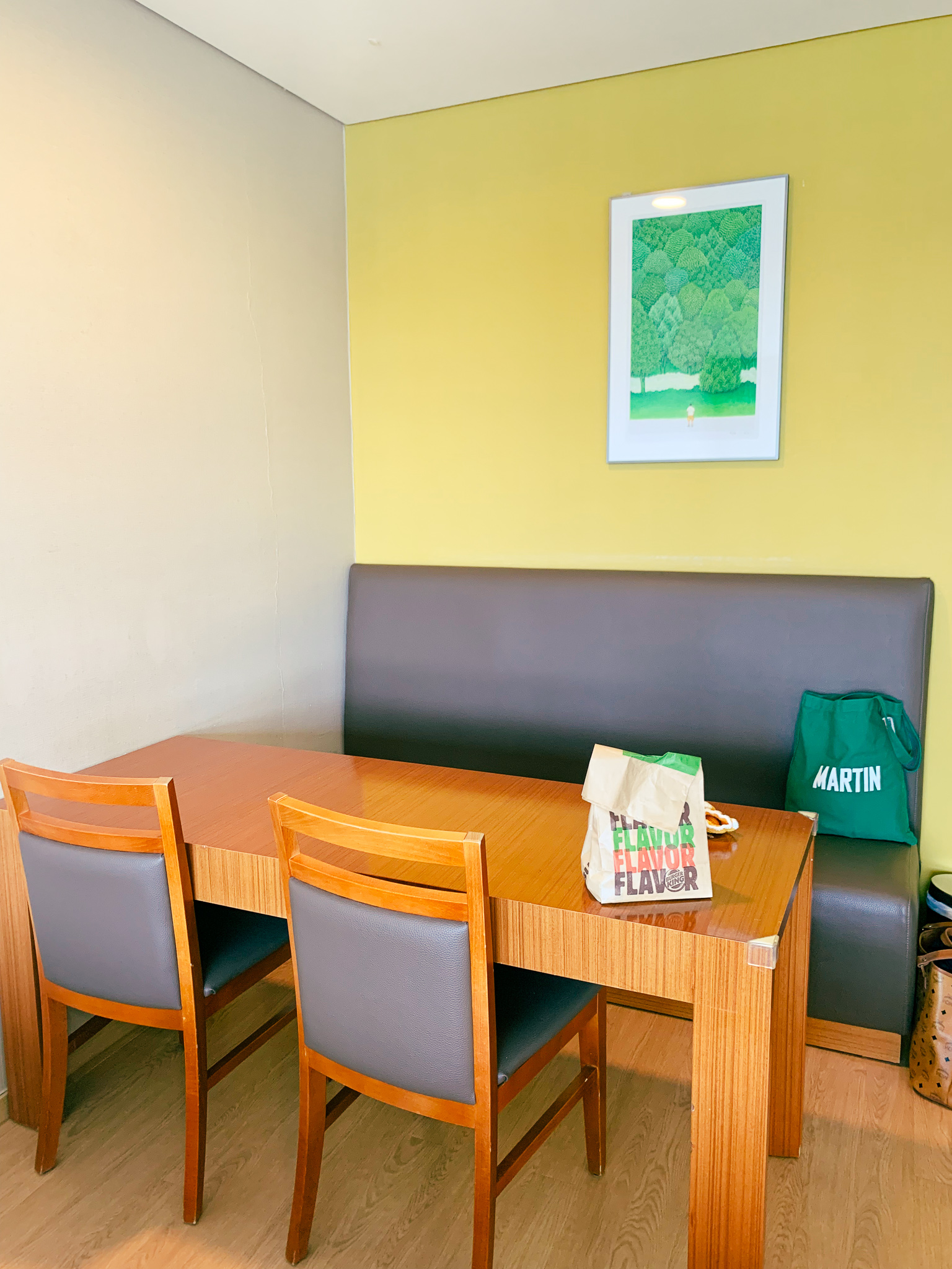 게다가 객실 한켠에는 이렇게 테이블과 의자가 있어 친구들과 혹은 가족과 왔을 때 함께 식사를 하거나 앉아서 이야기하거나, 한 잔 하기에도 딱 좋았다. 노란 벽지와 어우러지는 그림도 마음에 들었고, 저 안쪽 의자에 앉아 바다를 보며 먹는 버거킹은 지금까지 먹은 버거킹 중에 제일 맛있는 버거킹이었다.